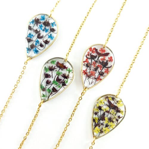 Vous pouvez découvrir dans la collection, des bijoux réalisés avec des fleurs d’érable seule, mais aussi avec un mélange de fleurs de carotte naturellement blanche, mais également des fleurs teintées par nos soins en rouge, vert, bleu, rose…