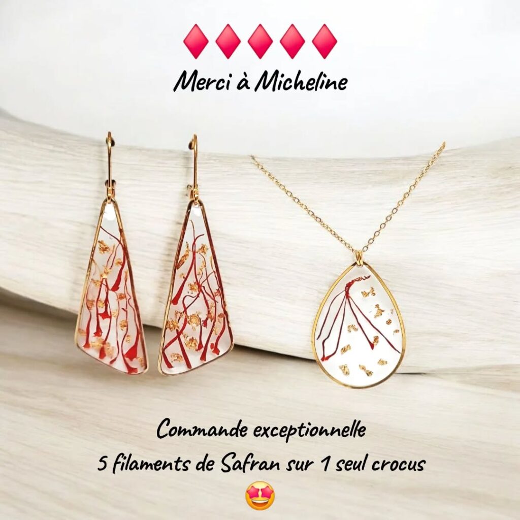 🌷Une commande d’exception : le collier aux cinq filaments d’un seul crocus 🌷Certaines créations naissent d’une demande rare. Précieuse. Presque confidentielle. 🌷Ce collier incarne l’exception absolue : cinq filaments de safran issus d’un seul et unique crocus, délicatement préservés pour conserver leur intensité et leur symbolique. Une rareté botanique transformée en trésor intemporel. 🌷Surnommé l’or rouge, le safran traverse les siècles comme symbole de lumière et de noblesse. Ici, il ne se contente pas d’être porté — il est magnifié. Chaque filament semble suspendu dans le temps, protégé par un écrin façonné à la main. 🌷L’excellence du geste artisanal Derrière cette pièce unique se révèle un travail d’orfèvre où patience et précision sont essentielles. 🌷Un écrin de lumière Des boucles d’oreilles assorties viennent parfaire l’ensemble, délicatement rehaussées de fines paillettes d’or qui captent la lumière à chaque mouvement. L’alliance du safran et de l’éclat doré crée une harmonie rare, à la fois naturelle et profondément élégante. 🌷Plus qu’un bijou, une signature Ce collier est une émotion devenue matière. |