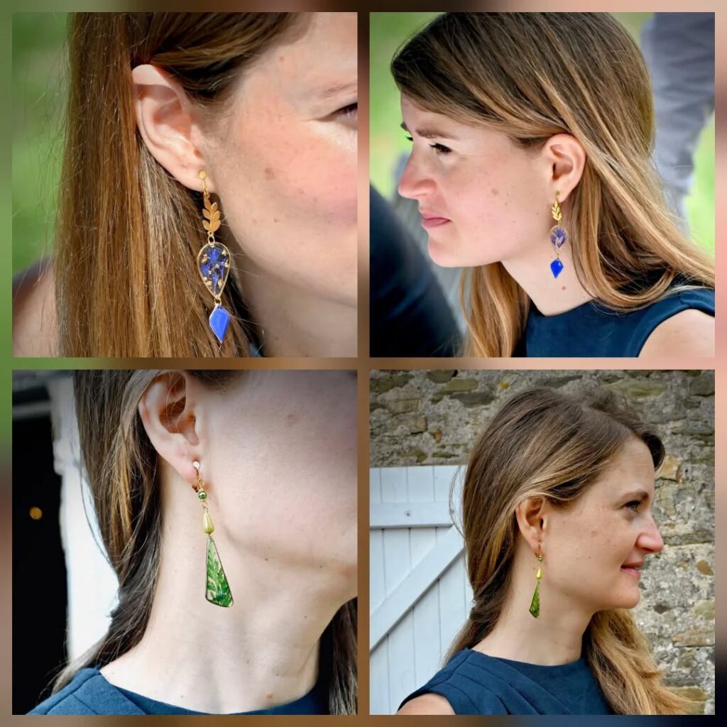 🌿 La seconde paire explore des nuances vertes naturelles, ornée de fougère soigneusement intégrée et accompagnée de deux perles assorties. Elles sont également montées sur acier inoxydable, pour garantir confort et résistance au quotidien.